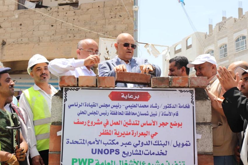 وضع محافظ محافظة تعز نبيل شمسان، اليوم، حجر الاساس لمشروع رصف حي البعرارة بمديرية المظفر بطول 4500 متر، بتمويل البنك الدولي عبر مكتب الامم المتحدة لخدمات المشاريع العامة (UNOPS).