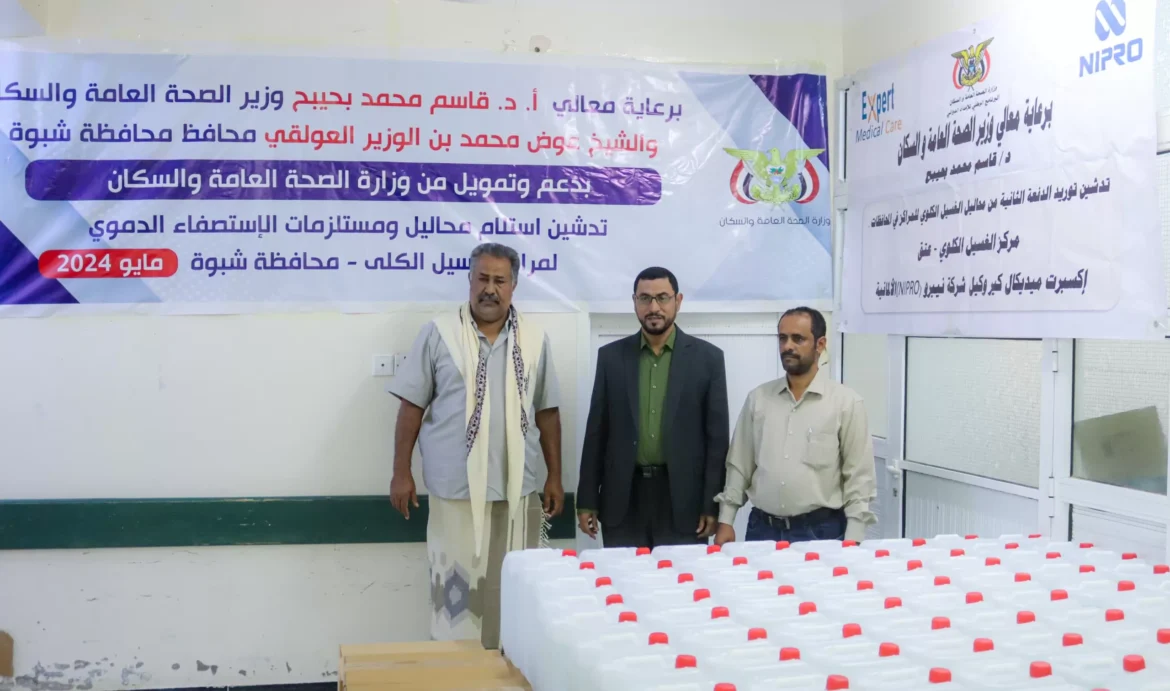 رفدت وزارة الصحة والسكان، اليوم، مركزي غسيل الكلى في كلٍ من عتق وعزان بمحافظة شبوة بدفعة جديدة من محاليل ومستلزمات الاستصفاء الدموي والمخصصة لخمسة الآف جلسة غسيل.