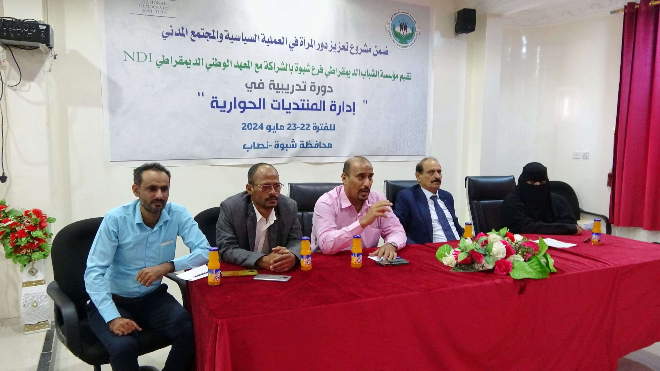 اختتمت اليوم في مدينة عتق بمحافظة شبوة دورة تدريبية حول إدارة المنتديات الحوارية وذلك ضمن مشروع تعزيز دور المرأة في العملية السياسية والمجتمع المدني الذي ينفذه فرع مؤسسة الشباب الديمقراطي بالمحافظة بالشراكة مع المعهد الوطني الديمقراطي NDI .