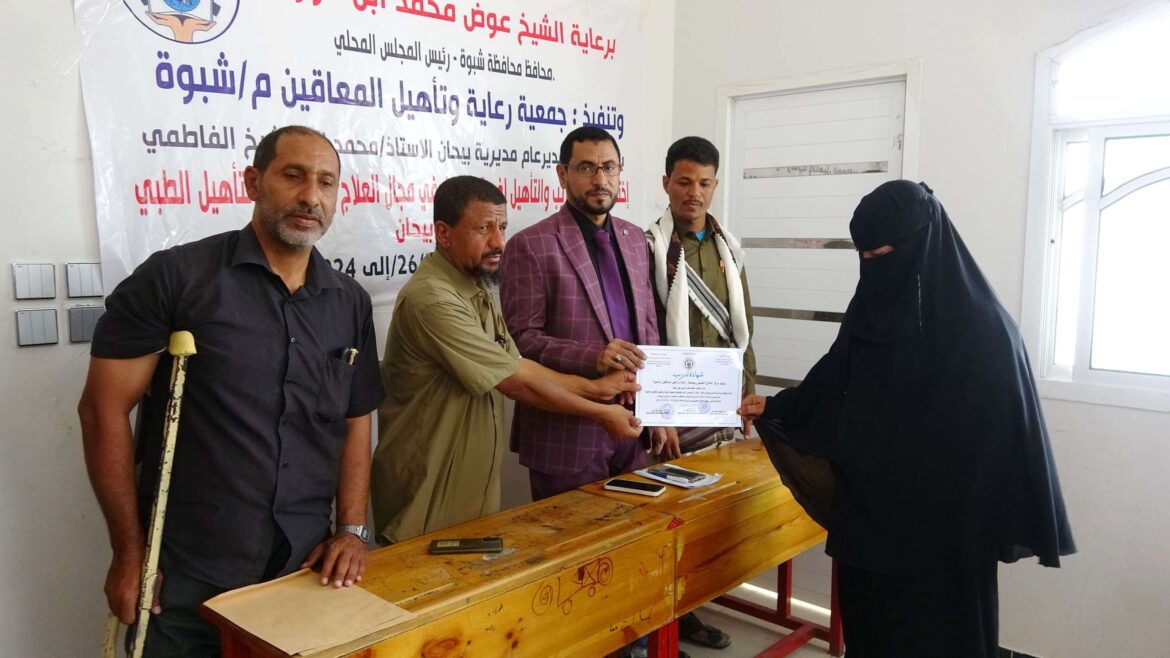 اختتمت اليوم، في مبنى جمعية رعاية وتأهيل المعاقين بمحافظة شبوة، الدورة التدريبية الخاصة بتأهيل فريق العمل في مجال العلاج الطبيعي بمديرية بيحان.