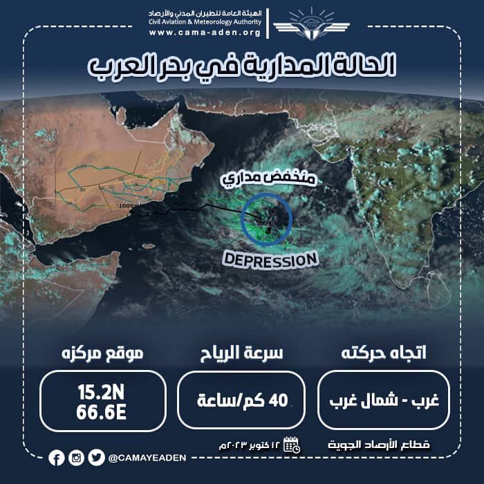 قال مركز التنبؤات الجوية التابع للهيئة العامة للطيران المدني والأرصاد ” إن آخر مستجدات الحالة المدارية في بحر العرب، اليوم السبت، تشير إلى أن منطقة الضغط الجوي المنخفض التي تم تحديدها يوم أمس فوق شرق ووسط بحر العرب تحركت باتجاه غرب وشمال غرب موقعها، مع دوران للنظام مصاحب يمتد حتى طبقات عالية في الغلاف الجوي”.
