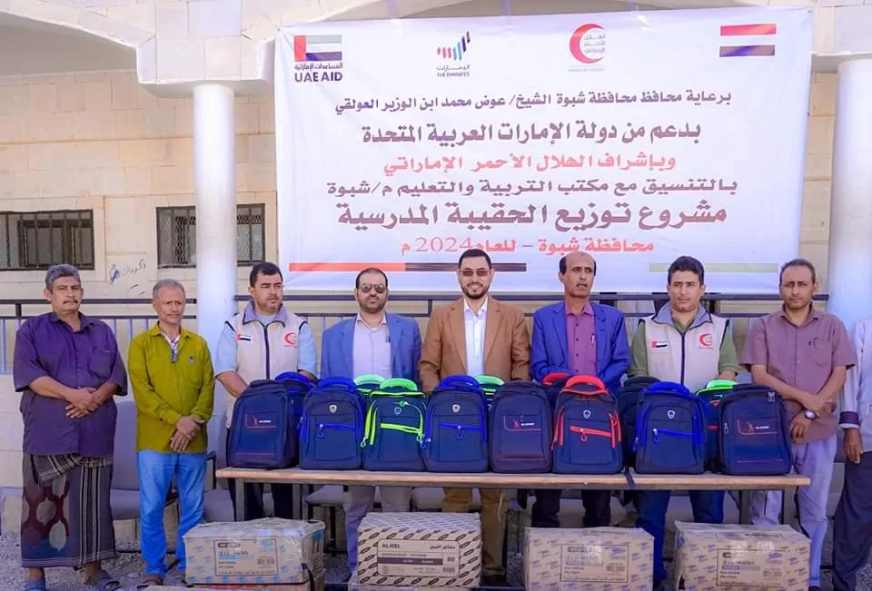 دشن وكيل محافظة شبوة الدكتور عبدالقوي لمروق، ومدير عام مكتب التربية والتعليم بالمحافظة سالم حنش اليوم مشروع توزيع 3500 حقيبة مدرسية مع مستلزماتها التعليمية مقدمة من هيئة الهلال الأحمر الإماراتي.