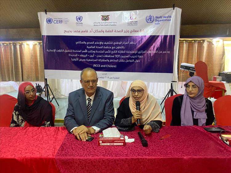ويتلقى 45 كادر من مدراء مكاتب الصحة بمديريات عدن ومدراء التثقيف في محافظات عدن وأبين والبيضاء والحديدة، معارف ومهارات حول المبادئ الأساسية العامة للتواصل بشأن المخاطر حول مرض الكوليرا ومؤشرات الرصد والتقييم ومكونات التخطيط للتدخل وتتبع الشائعات وإدارتها والرسائل الصحية وقنوات المراسلة.