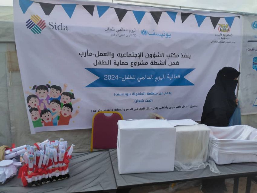 نطم مكتب الشؤون الاجتماعية والعمل بمحافظة مأرب، اليوم، يوماً ترفيهياً للأطفال النازحين في مخيم الجفينة- اكبر مخيم للنازحين في اليمن- احتفاء باليوم العالمي للطفولة الذي يصادف الـ 20 من نوفمبر في كل عام.