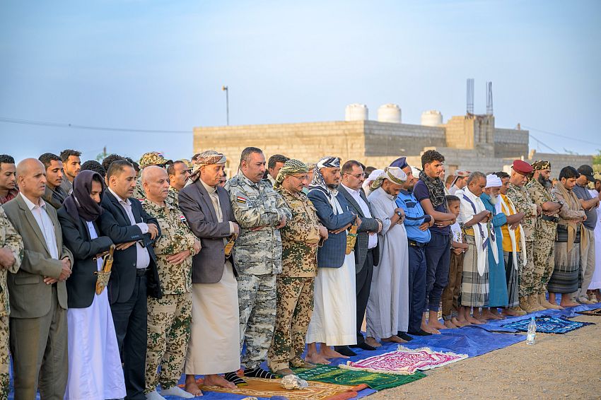 وعقب الصلاة والاستماع إلى خطبتي العيد تبادل طارق صالح، مع القيادات العسكرية والسياسية والمدنية وجموع المواطنين التهاني العيدية بهذه المناسبة الدينية العظيمة.