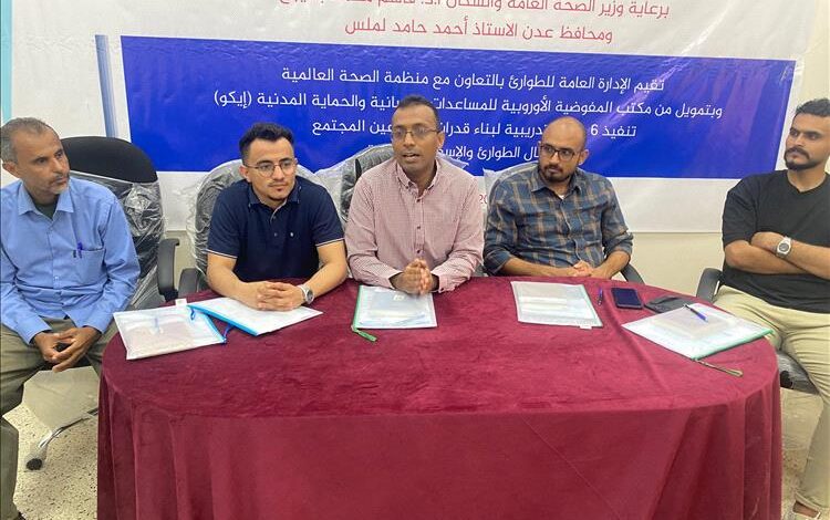 دشنت الإدارة العامة للطوارئ بوزارة الصحة العامة والسكان، بالتعاون مع منظمة الصحة العالمية وبتمويل من مكتب المفوضية الأوروبية للمساعدات الإنسانية والحماية المدنية بالعاصمة المؤقتة عدن، اليوم، برنامجاً تدريبياً لبناء قدرات متطوعي المجتمع في مجال الطوارئ والاسعافات.