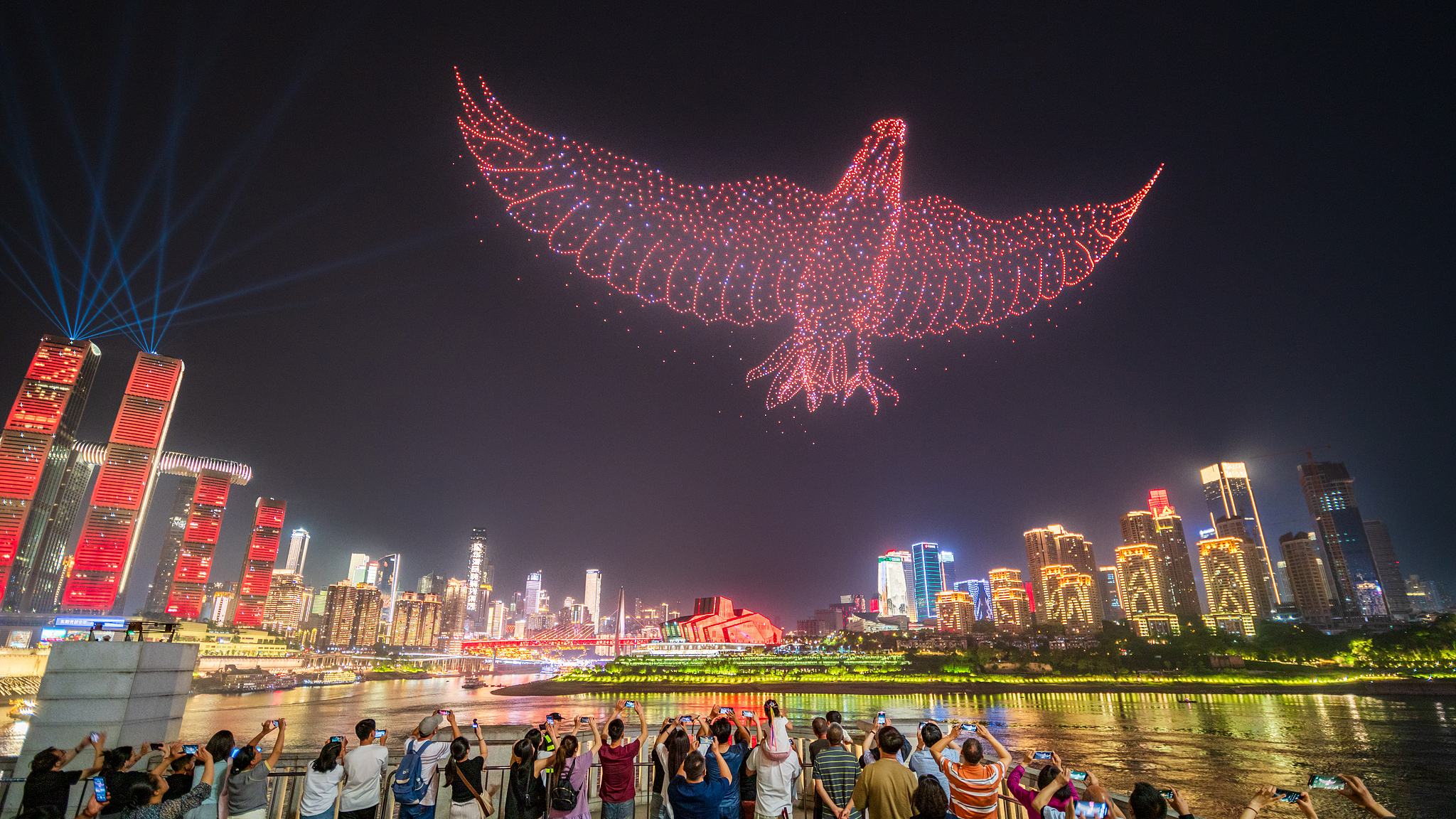 أقيم في مقاطعة تشونغتشينغ جنوب غرب الصين مساء يوم 18 مايو عرض ضوئي بطائرات بدون طيار وعرض كلمة “تشونغتشينغ الساحرة” في تشونغتشينغ. انطلقت آلاف الطائرات .بدون طيار في المنطقة الأساسية لنهري تشونغتشينغ وضفتيها الأربع، لتقدم للناس وليمة بصرية من التكنولوجيا والفن