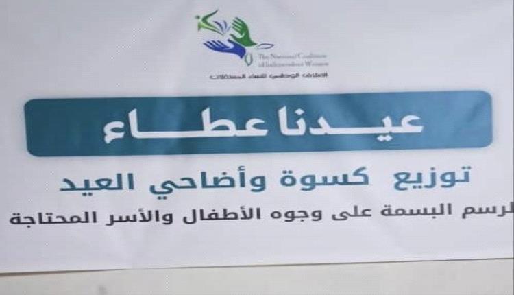 وزع الائتلاف الوطني للنساء المستقلات اليوم، كسوة العيد بمحافظة عدن وعدد من المحافظات، مستهدفًا مئات الأسر من الفئات الأشد احتياجًا، والأيتام وأسر الشهداء.