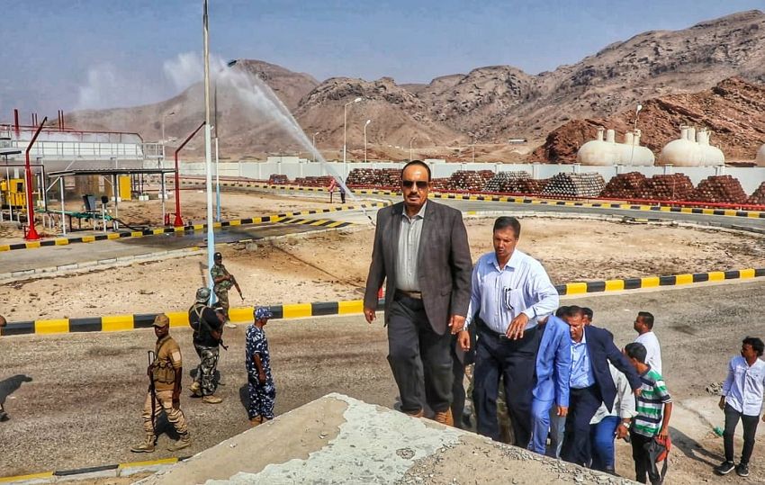 تفقد محافظ حضرموت مبخوت بن ماضي، اليوم، سير العمل في منشأة غاز بروم بمديرية بروم ميفع.