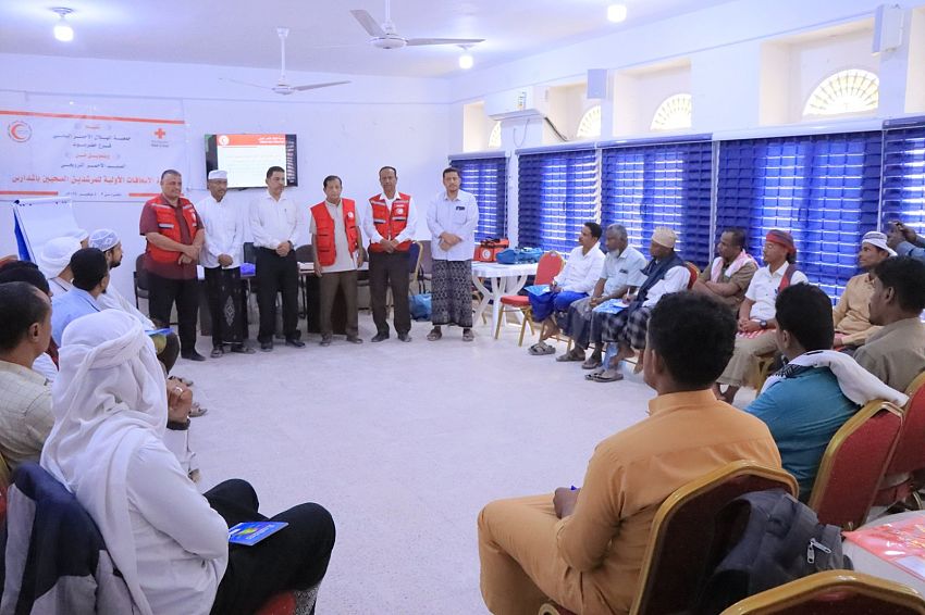 ويتلقى 50 معلماً ومعلمة على مدى ثلاثة أيام، تم توزيعهم على قاعتين، معلومات ومفاهيم ومهارات وخبرات نظرية وتطبيقية من قبل مدربي ومدربات من الكوادر المؤهلة من فرع الهلال الأحمر اليمني بحضرموت.