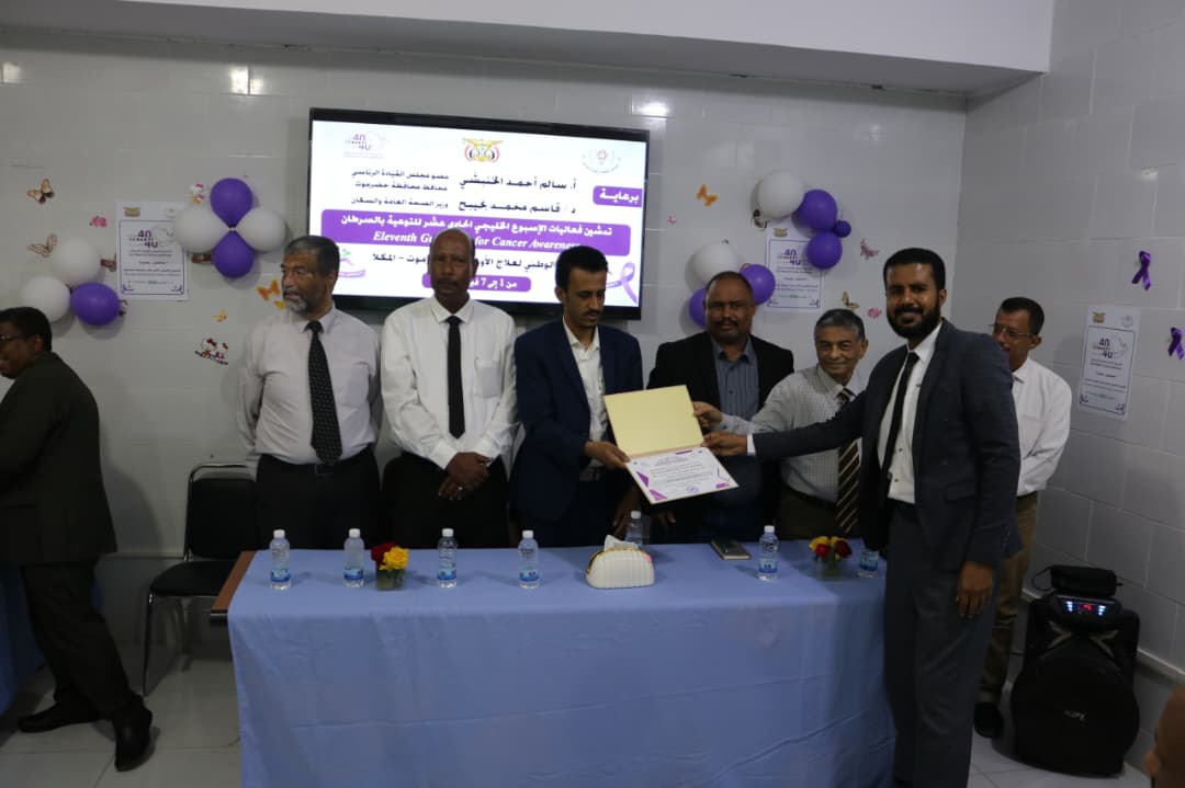من جانبه أشار الدكتور زكي فرج صعنون المدير العام للمركز الوطني لعلاج الأورام بالمكلا اننا اليوم نكرم الكادر الطبي والعاملين بالمركز وكل المسهمين في هذا الأسبوع ، داعيا كافة منظمات المجتمع المدني بالمحافظة إلى الاهتمام بنشر الوعي الصحي المجتمعي .