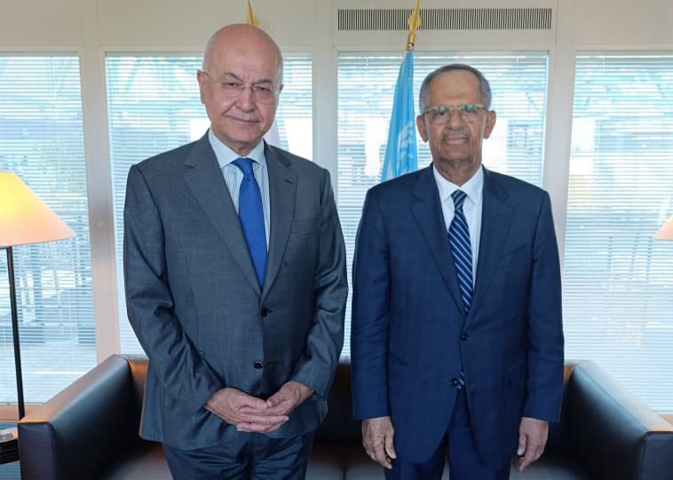 بحث مندوب اليمن الدائم لدى الأمم المتحدة في جنيف السفير الدكتور علي مجور، اليوم، مع المفوض السامي للأمم المتحدة لشؤون اللاجئين، الدكتور برهم صالح، تعزيز الشراكة والتنسيق المشترك لمواجهة التحديات الإنسانية المتفاقمة في اليمن.